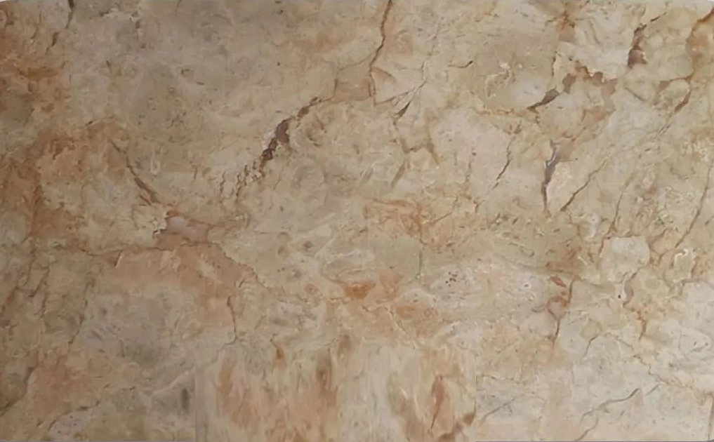سنگ مرمریت مینیاتور دارای رنگ کرم طلایی - صورتی همراه با رگه ها و فسیل هایی تیره و روشن